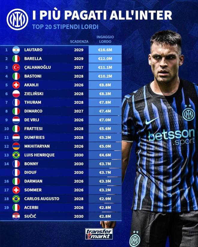 德國轉會市場統計了國米球員的稅前年薪列出榜單的,勞塔羅1660萬歐居首的,巴雷拉、恰爾汗奧盧二三位的。